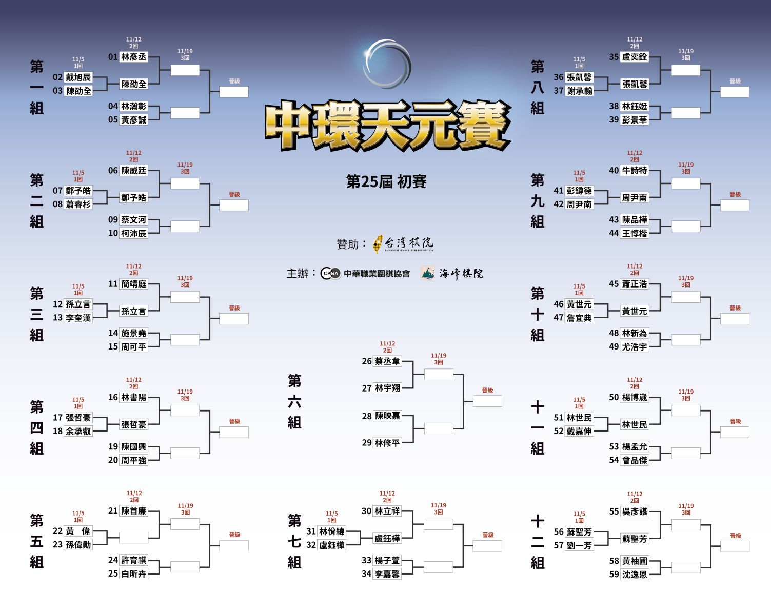 由台灣棋院文化基金會贊助的第25屆中環天元賽,於今(5)日展開初賽首輪較量,所有參賽棋士無不卯足全力,爭取通往複賽的12名席位。