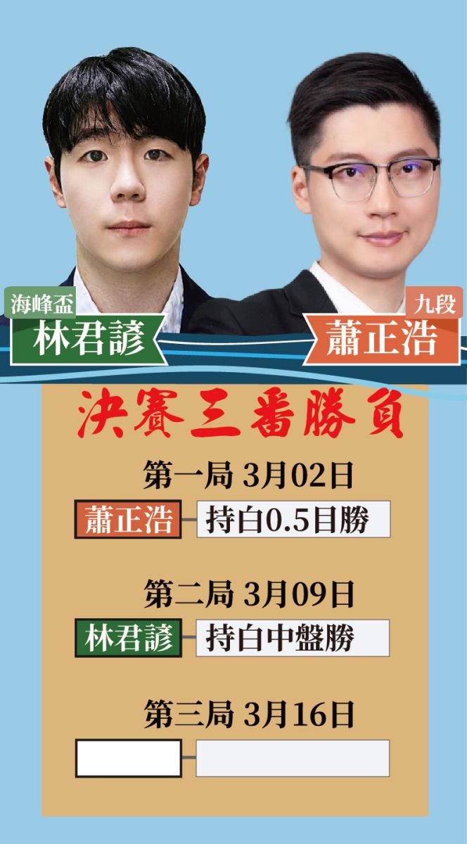 隨著林君諺扳平比數,第18 屆海峰盃決賽將進入關鍵的第三局。是林君諺能成功衛冕、達成二連霸?還是蕭正浩能重返巔峰、奪下生涯第三座海峰盃冠軍?全台棋迷拭目以待。