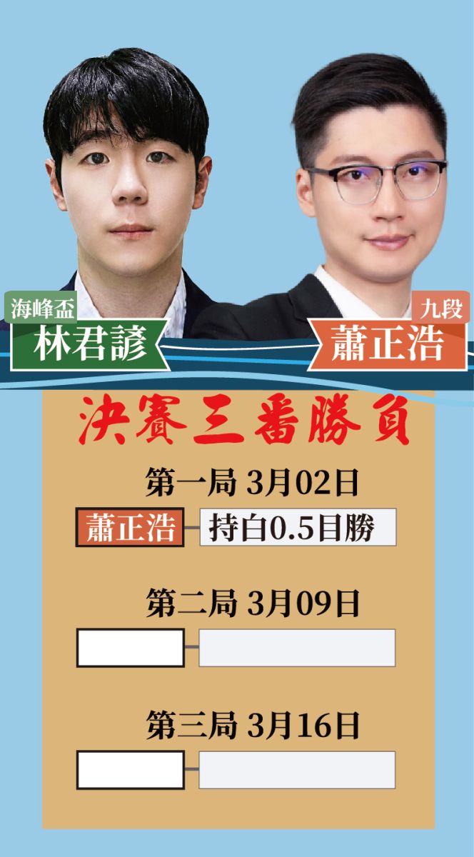 雙方鏖戰至最後一刻,局面數度陷入膠著,最終蕭正浩九段憑藉極其穩定的心態,以「半目」之差戰勝林君諺,搶下決賽首勝,目前1:0 領先。