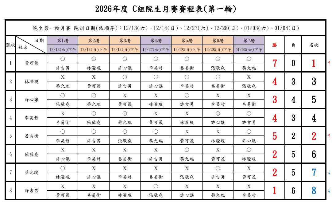 2026年度 院生第一輪月賽 所有賽程已結束,各組詳細戰績如下: