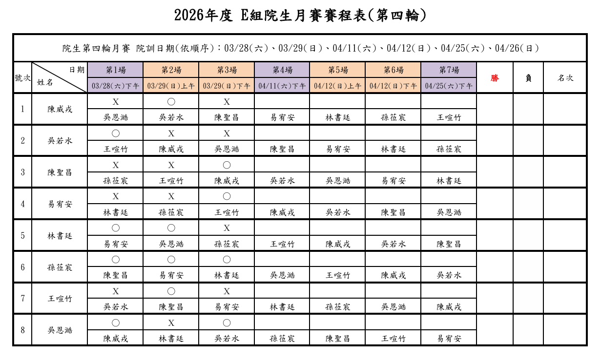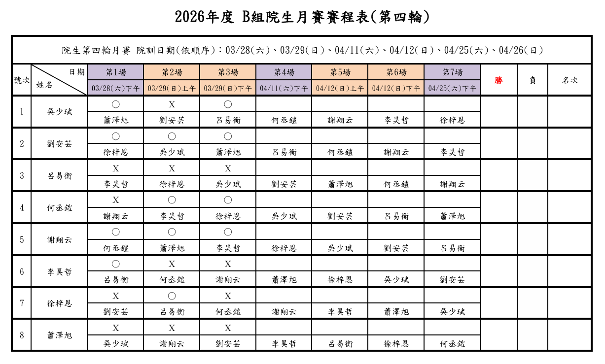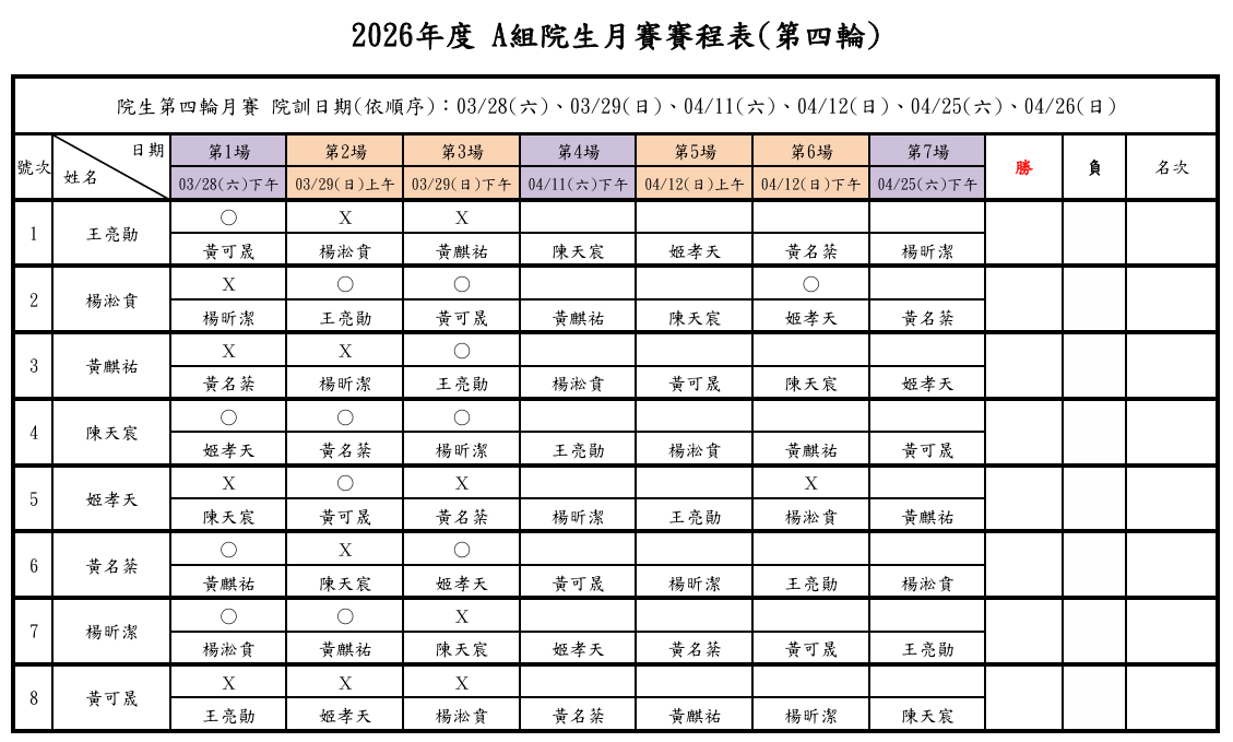2026年度 院生第四輪月賽 - 第一週之訓練賽程已結束,各組詳細戰績如下: