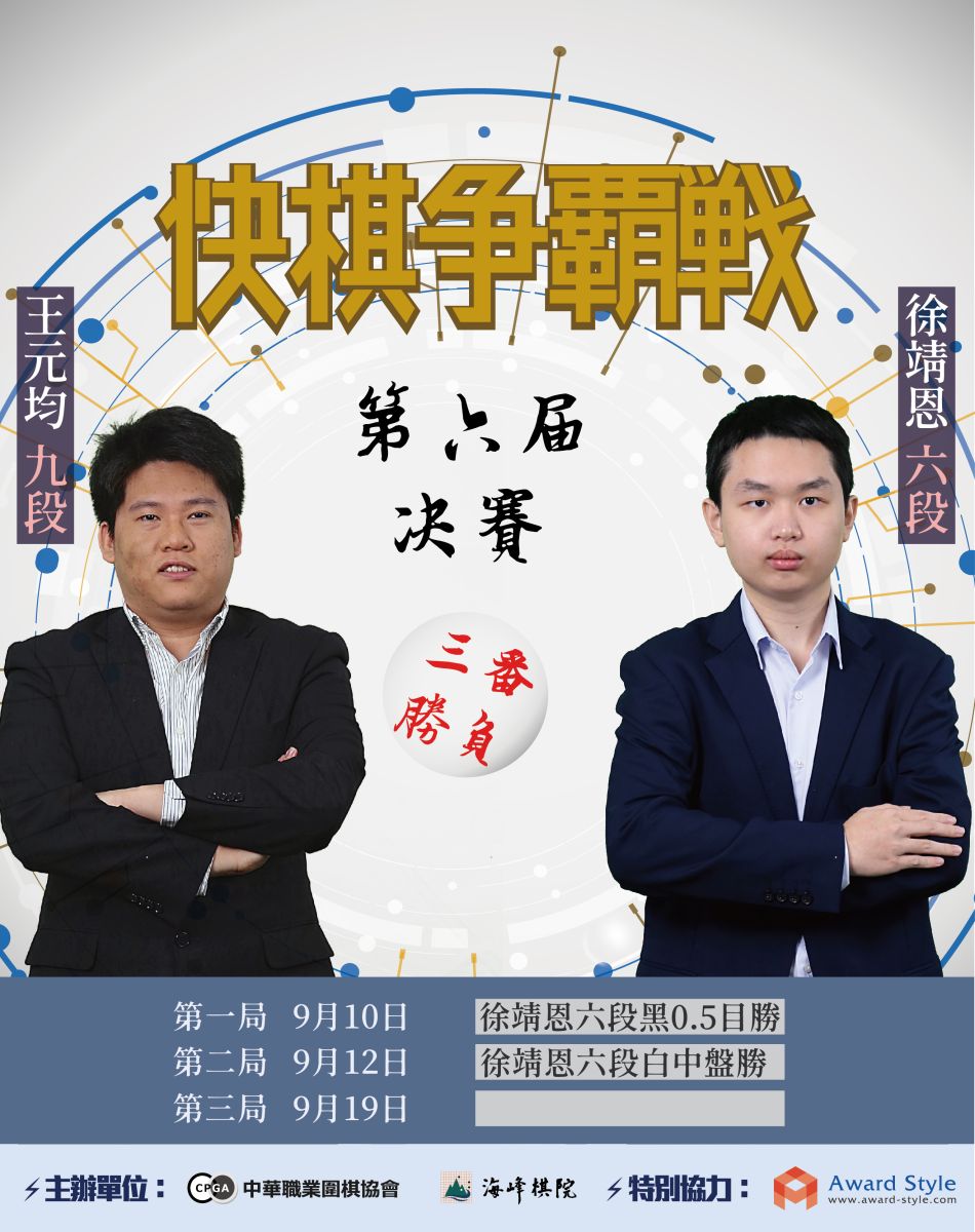 備受矚目的第6屆快棋爭霸戰決賽三番勝負今天(9月10日)正式開打,首局由年僅18歲的徐靖恩六段對上經驗豐富的王元均九段。