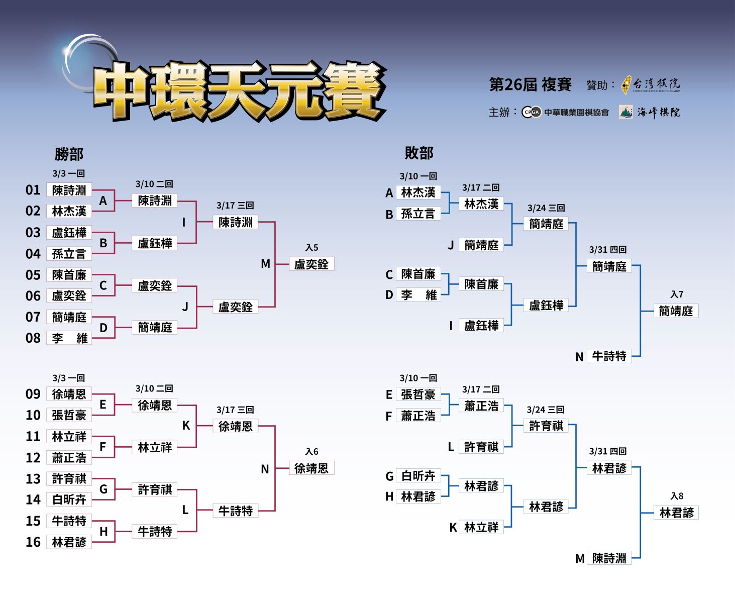 第26屆中環天元複賽3月31日在海峰棋院落幕,複賽經過數回合激戰,勝部徐靖恩快棋王、盧奕銓七段,以及敗部林君諺海峰盃、簡靖庭新人王,四人脫穎而出晉級循環圈!