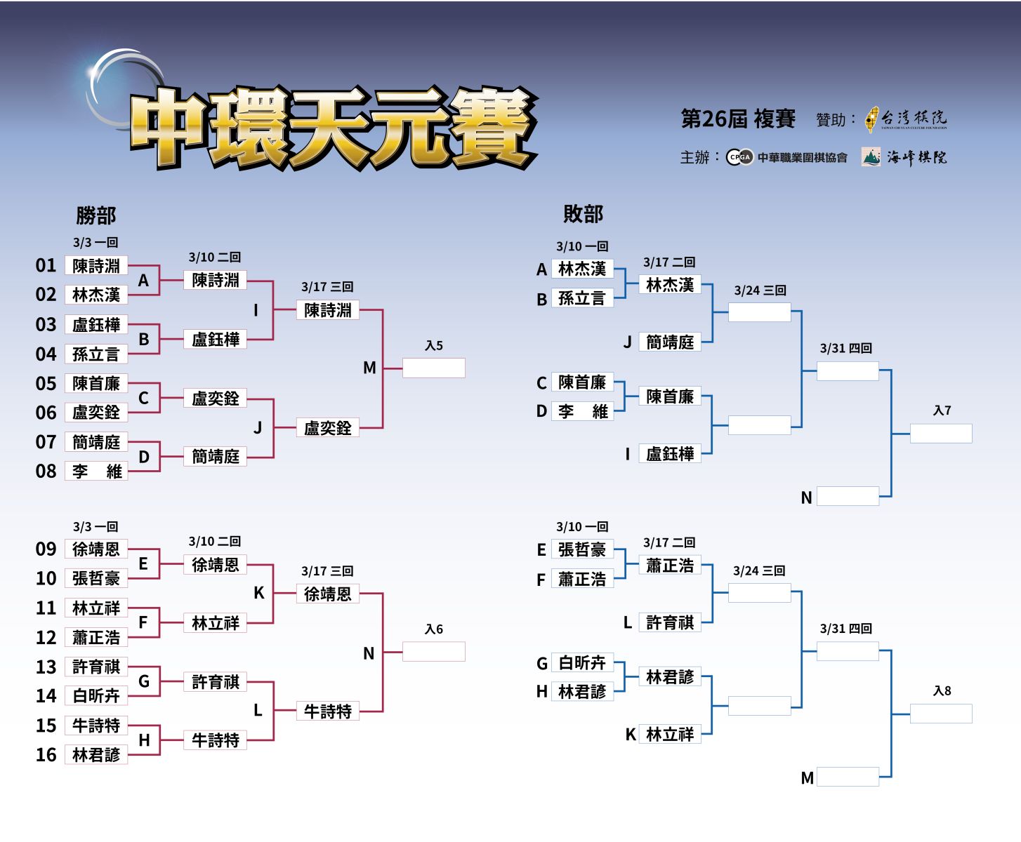 下一輪賽事將於3/17(二)繼續舉行。