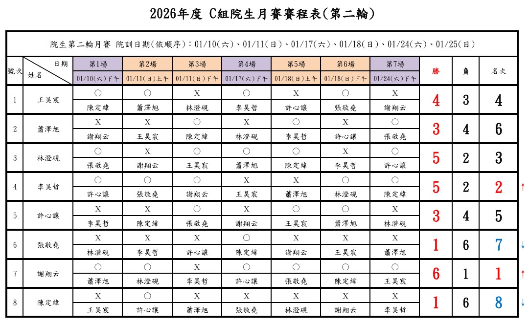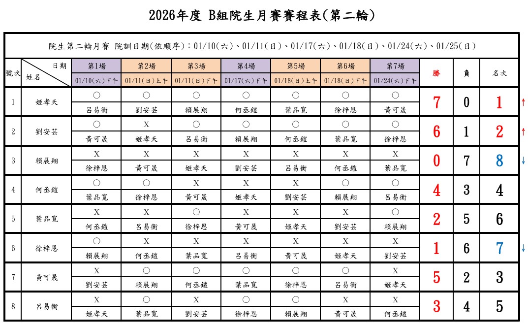 2026年度 院生第二輪月賽 所有賽程已結束,各組詳細戰績如下: