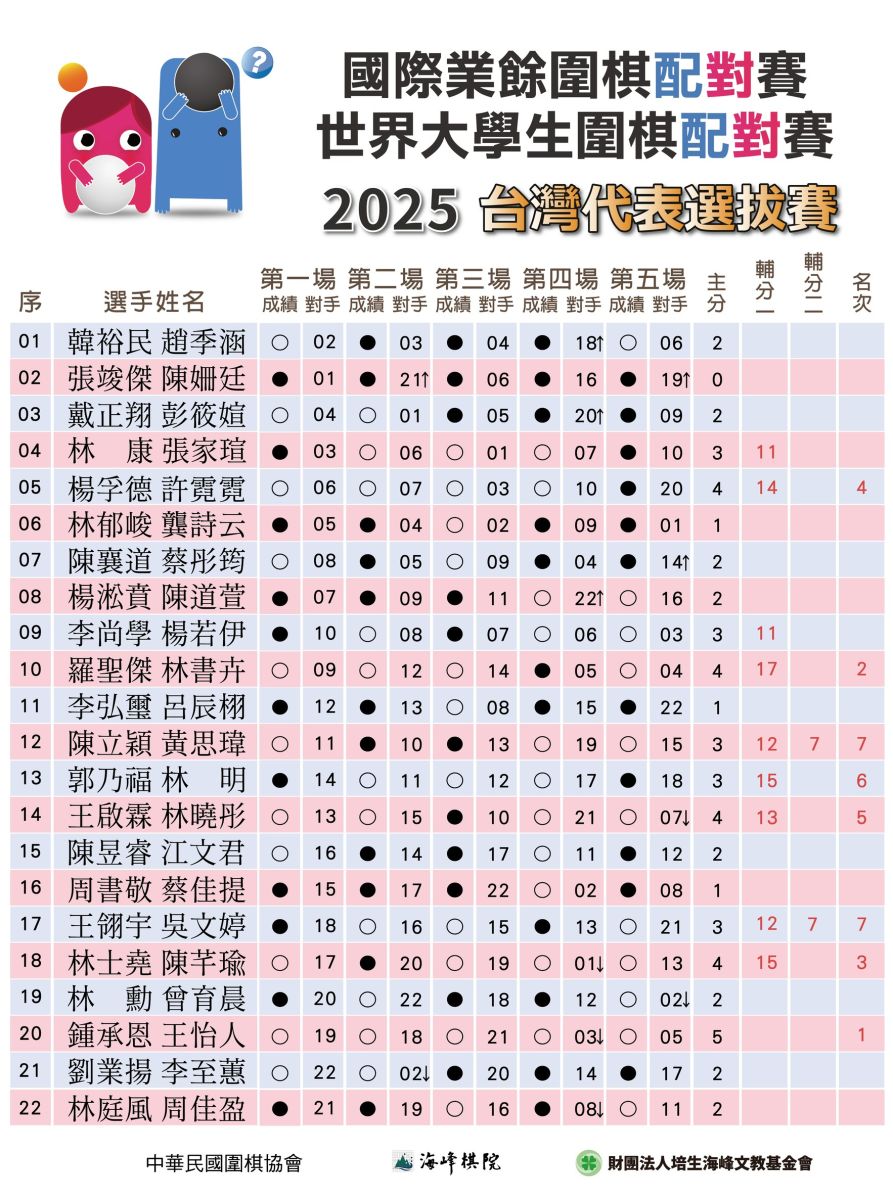 2025年「國際業餘圍棋配對賽 & 世界大學生圍棋配對賽」台灣代表權選拔賽,於今(23日)在海峰棋院落幕。今年共吸引22支業餘頂尖隊伍組隊參賽,經過五回合的激烈較量,由鍾承恩7段/王怡人7段五戰全勝奪得冠軍,同時獲得明年九月份在名古屋舉行的國際組代表權。
