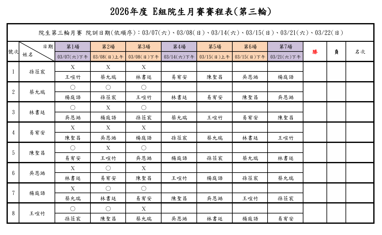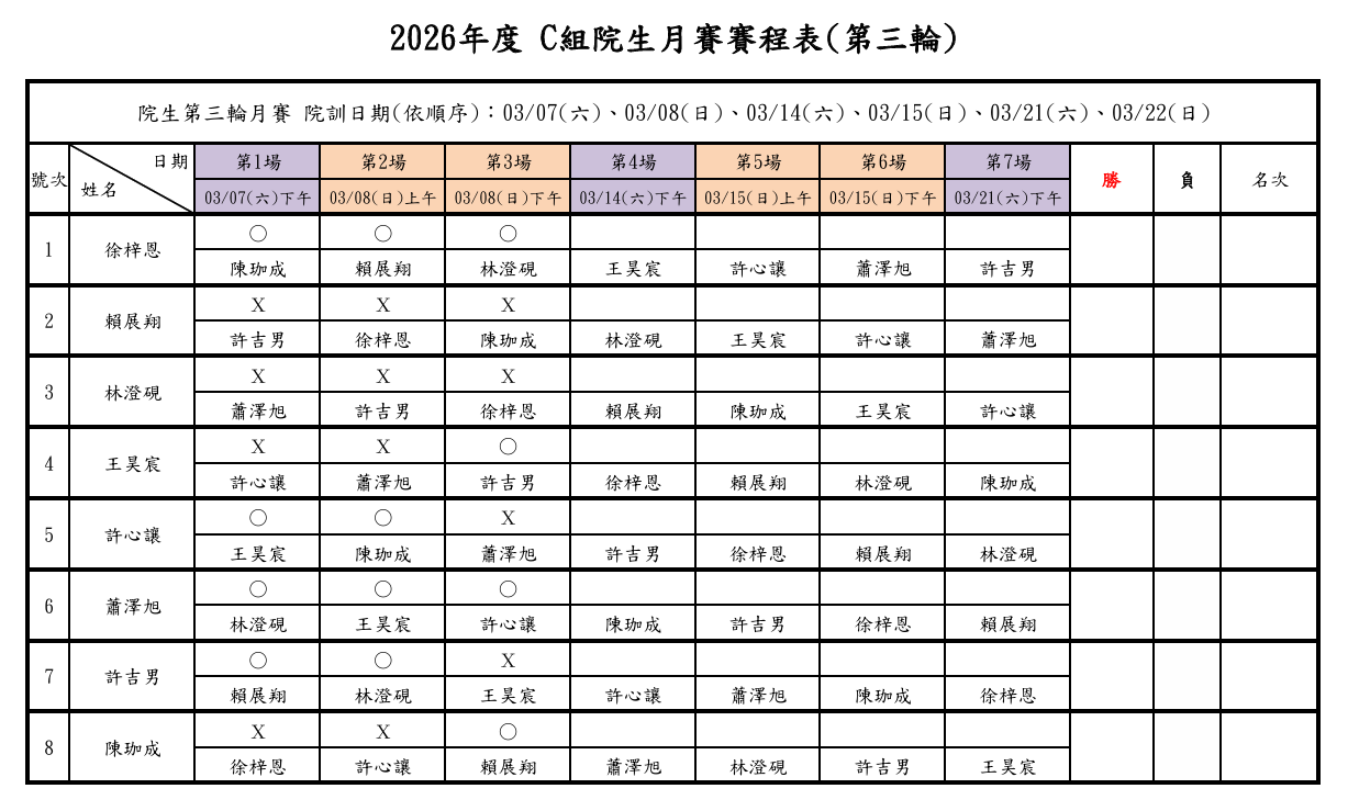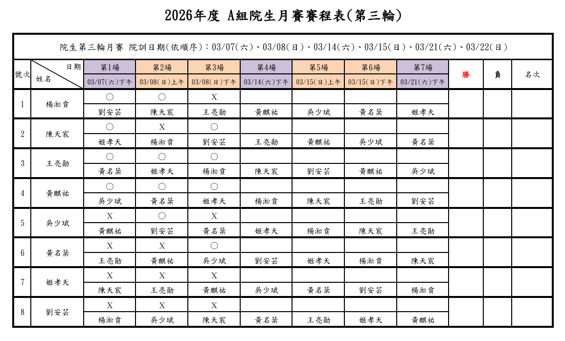 2026年度 院生第三輪月賽 - 第一週之訓練賽程已結束,各組詳細戰績如下: