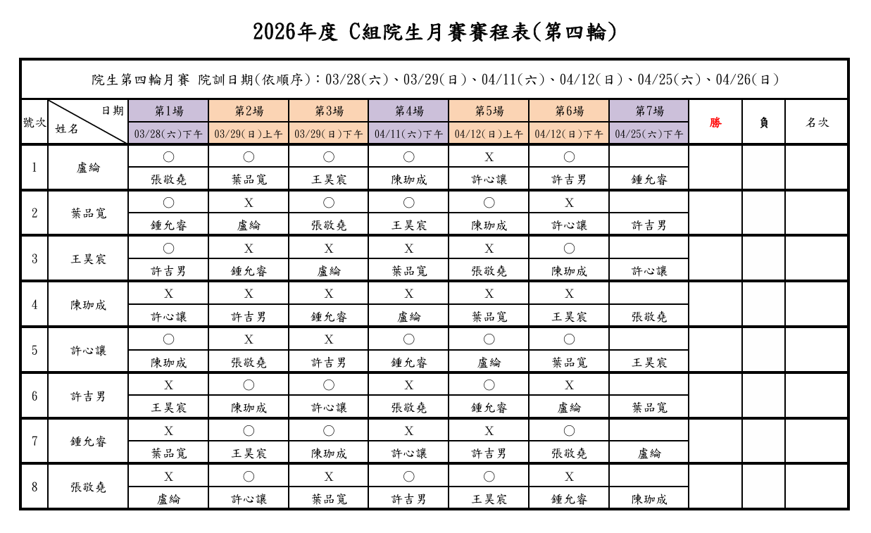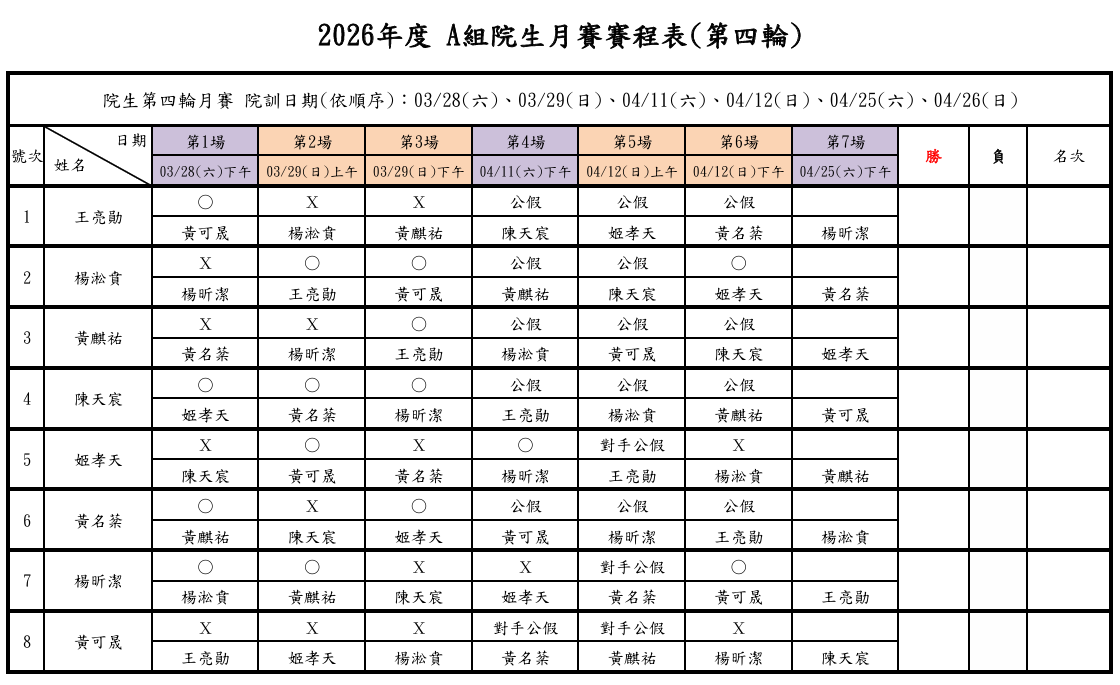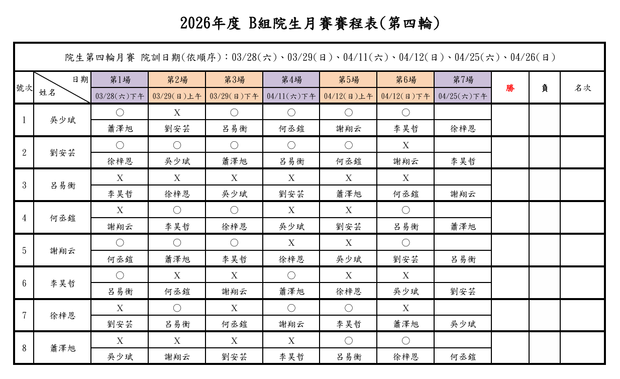 2026年度 院生第四輪月賽 - 第二週之訓練賽程已結束,各組詳細戰績如下: