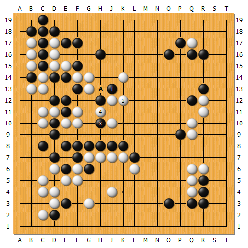 實戰白棋跟著1應,黑棋逃過一劫。白3尖處理中央讓劫,但黑4消劫也可考慮繼續A圍地,因為中央B斷還有許多劫材。實戰這樣基本又回到五五開的局面進入後半盤。
