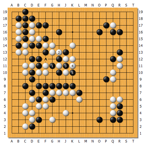 實戰黑1繼續打吃,白棋再2反打,黑3、5提完開劫。因為此後白棋A叫吃可連絡三子,因此此劫應該是黑棋壓力稍大一些。將會關係到全局厚薄。