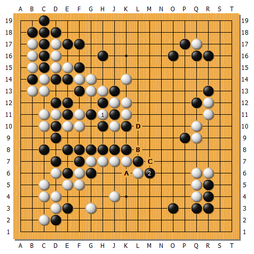 實戰白棋1選擇回到左下退收官,黑2貼右邊走厚。事實上上邊是最大的地方,白應A扳和黑B斷交換,白棋就先手防住黑C碰的官子,之後白棋再去D擋住是最好的收官方式,如此將會是白棋稍好的局面。