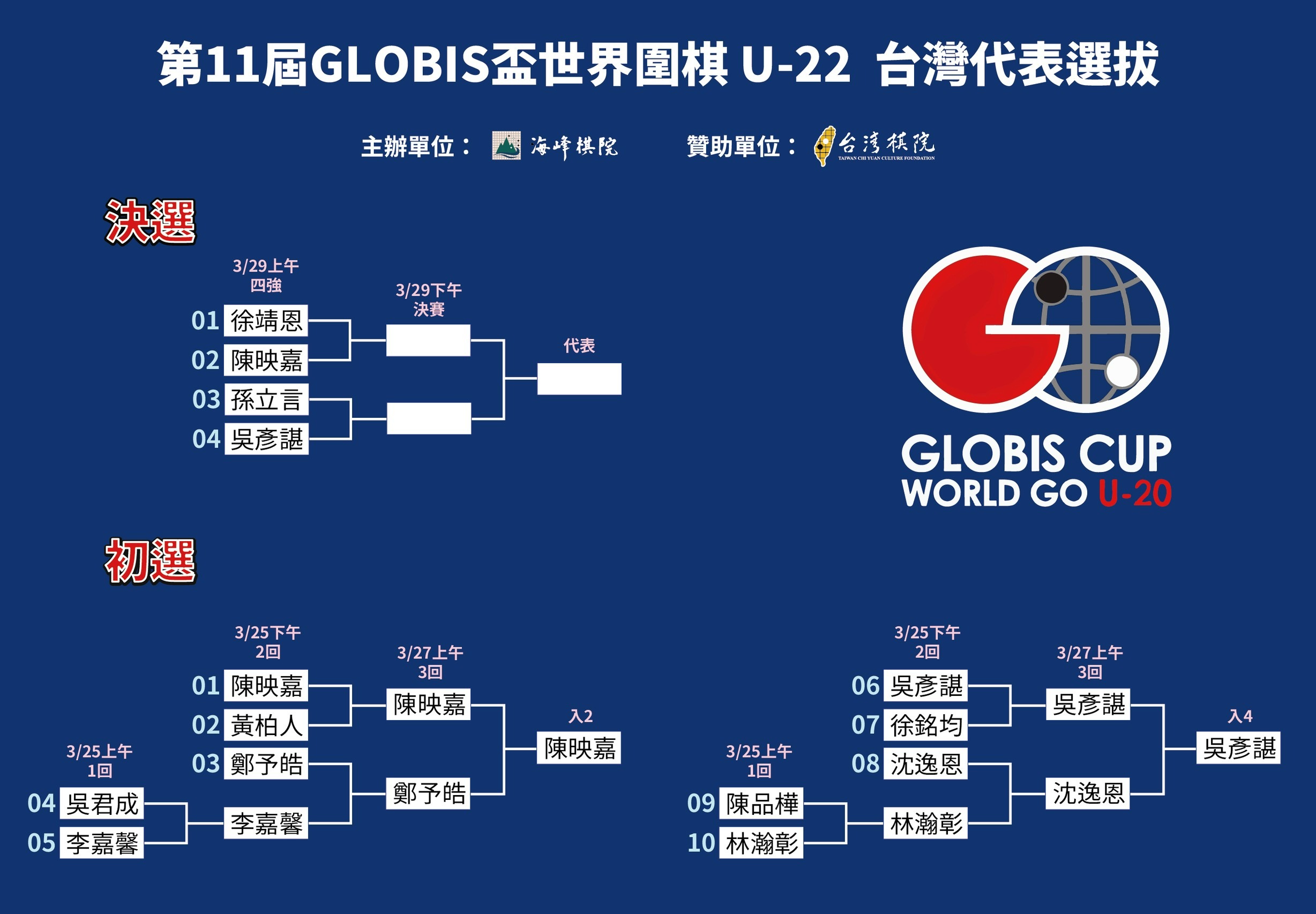 2026/03/27 第11屆GLOBIS盃世界圍棋 U-22 台灣代表選拔賽 初選成績