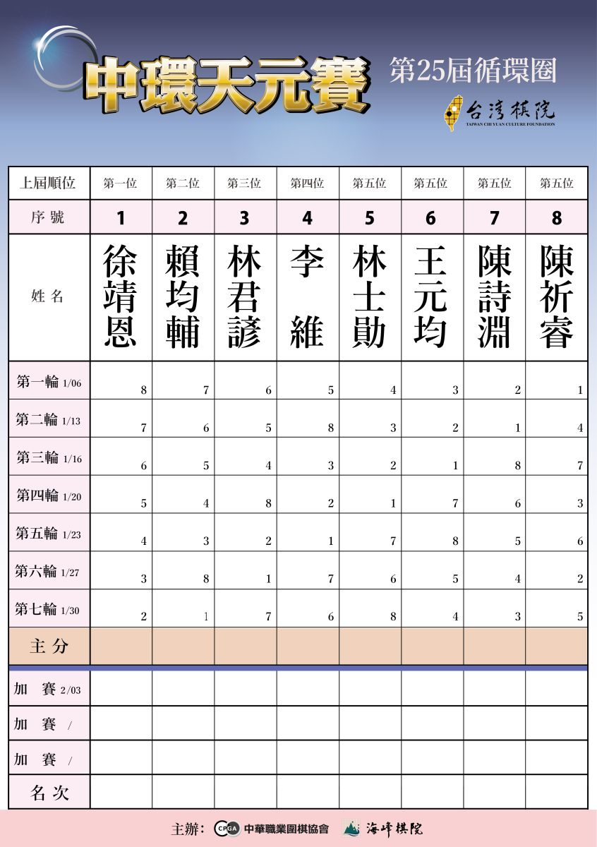 第25屆中環天元循環圈上屆保留者四名棋士為:徐靖恩快棋王、賴均輔名人、林君諺海峰盃和李維七段,以及新進循環圈四名棋士:林士勛八段、王元均九段、陳詩淵九段、和陳祈睿九段八位棋士組成的循環賽共七輪的賽事,第一輪於1月6日(二)上午11:00開賽,循環圈用時各2小時,最後3分鐘讀秒,讀秒60秒3次。詳細日程與對陣如下: