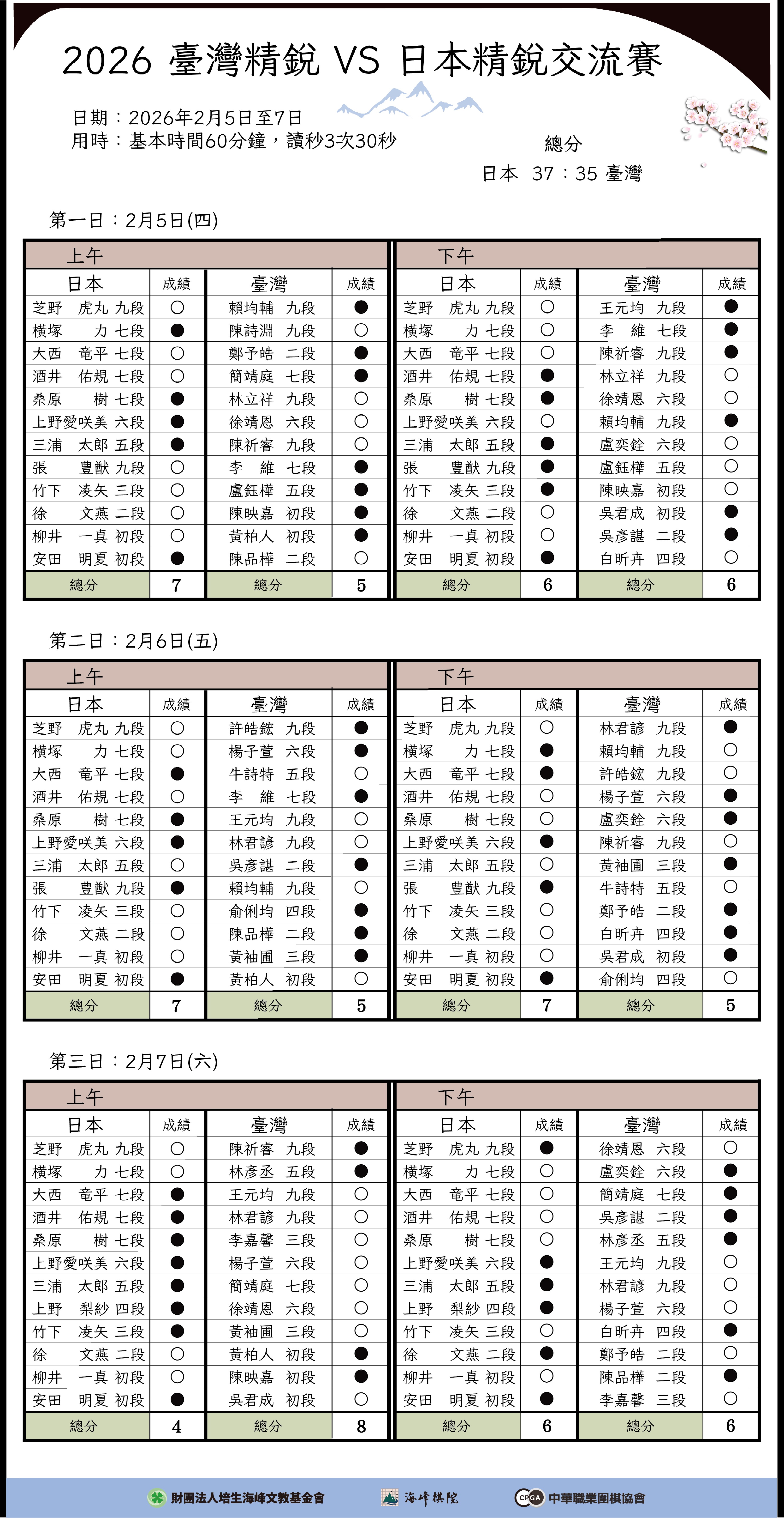 2026/02/07 2026臺日精銳交流賽棋譜 & 結果