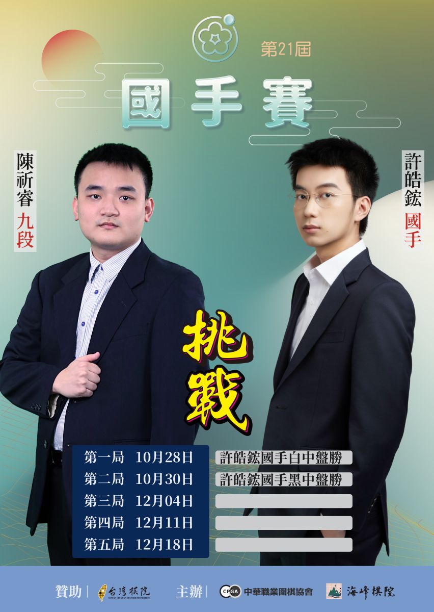 由台灣棋院文化基金會贊助的職業棋壇年度焦點——第21屆國手挑戰賽五番勝負,於今(28日)展開首局交鋒。衛冕者許皓鋐國手三度迎戰向他衝擊國手頭銜的陳祈睿九段。