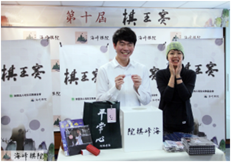 2017年海峰棋院舉辦的第10屆棋王挑戰賽戰況相當激烈,棋局進入尾聲前戰況也十分混沌,要在兩位令人喜愛的棋手擇一更是難以抉擇。筆者最後在記憶起「百年棋聖─吳清源大國手紀念特展」時,小兒曾與當時的「林君諺十段」合影,因此選擇了林棋士,很幸運能從新科棋王的手中得到了限量福袋。幾日後收到棋院寄來的福袋,映入眼簾的是筆運充滿力量的「平常心」3字。