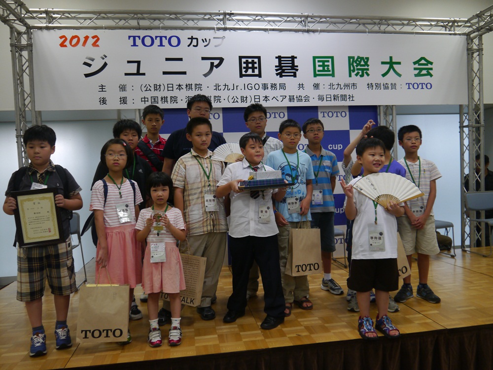 2012.08.06| 比賽訊息 2012/08/06 2012年TOTO杯青少年圍棋國際大會 臺灣團體合影 合影留念 臺灣選手合影 頒獎典禮 選手們一同做體操 比賽現場 大棋盤解說會 臺灣選手帶著滿滿的收穫 臺灣選手帶著滿滿的收穫 臺灣棋士成績表 2012年8月06日 TOTOカップジュニア囲碁国際大会の成績 無差別クラス 優勝 橋本淳平(はしもと じゅんぺい) 五段 熊本県 15歳 準優勝 奈須春樹(なす はるき) 七段 宮崎県 12歳 三位 西村僚太郎(にしむら りょうたろう) 六段 山口県 13歳 Aクラス 優勝 李辰冏(リ チェンジョン) 三段 上海 10歳 準優勝 呂周睿楊(ルジョウ ルイヤン) 三段 北京 8歳 三位 鄭博凡(ジョン ボファン) 五段 上海 12歳 Bクラス 優勝 ?文杰(イェン ウンジェ) 1級 上海 13歳 準優勝 山下りさ(やました りさ) 1級 福川南小学校 11歳 三位 鄒承桓(ゾウ チョンホワン) 5級 台北 9歳 Cクラス 優勝 高崎将大(たかさき まさと) 8級 佐賀大学 附属中学校 13歳 準優勝 ?君(ダン ジュン) 10級 上海 8歳 三位 山田健人(やまだ けんと) 8級 柳井小学校 9歳 Dクラス 優勝 屠 駿(トゥ ジュン) 12級 上海 9歳 準優勝 張 ?(ツァン ウエ) 18級 台北 11歳 三位 蔡佳欣(ツァイ ジアシン) 19級 台北 7歳