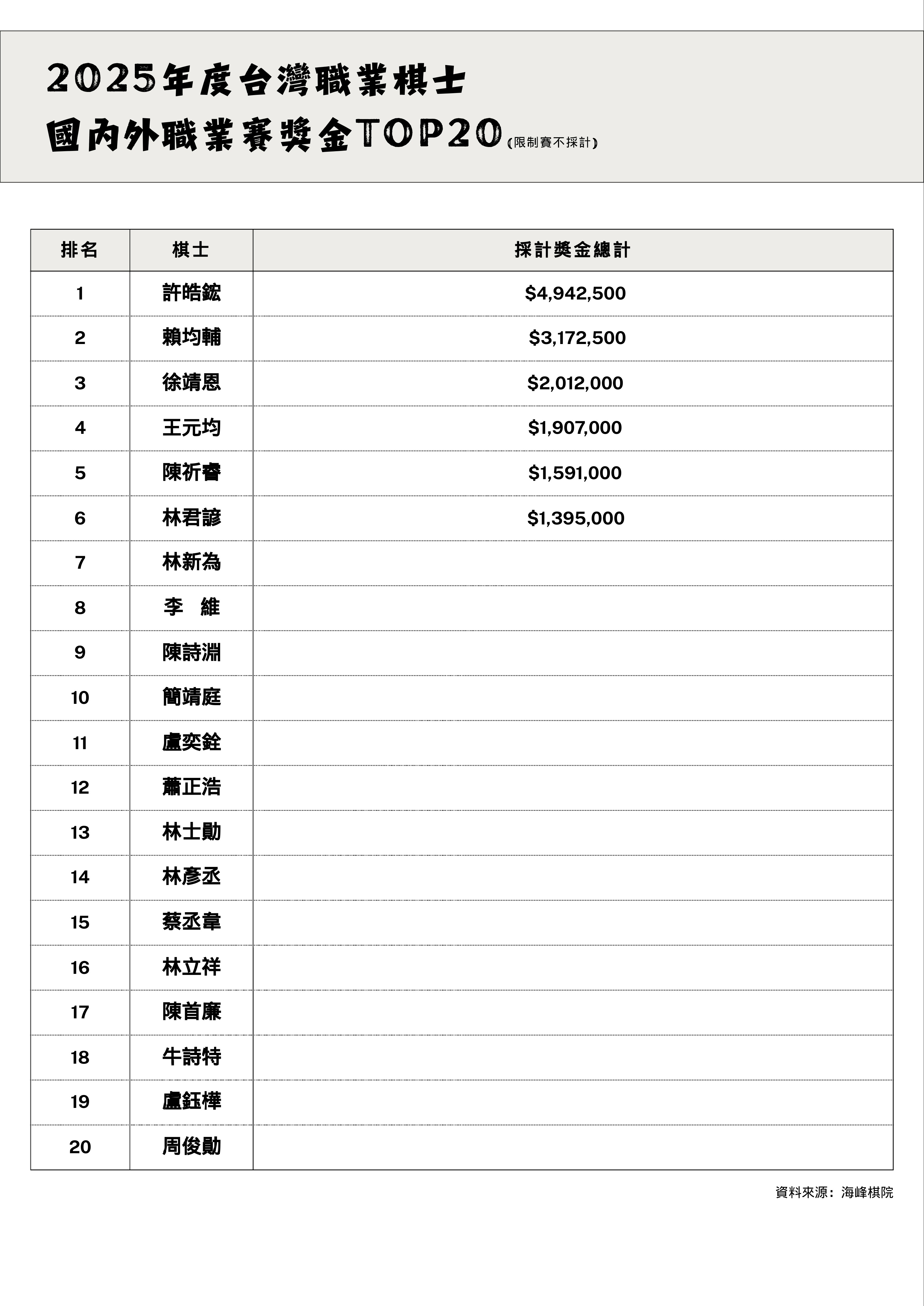 2026/01/05 2025年度「台灣職業棋士國內外職業賽獎金TOP20」最新版