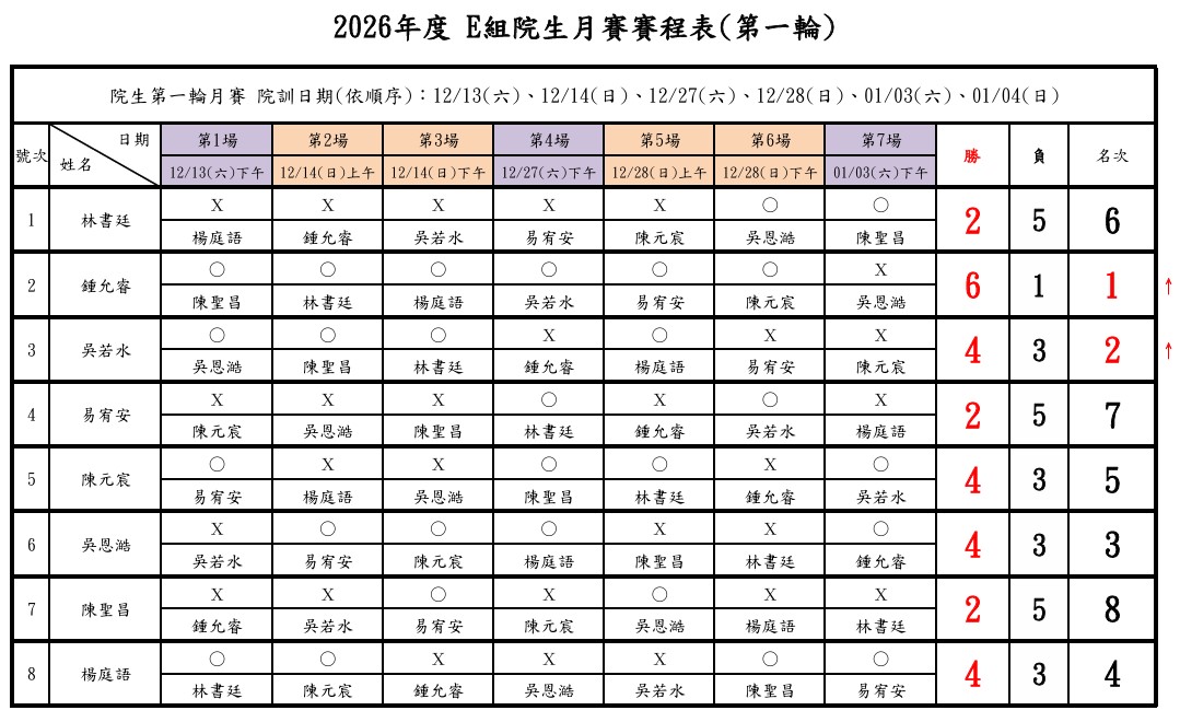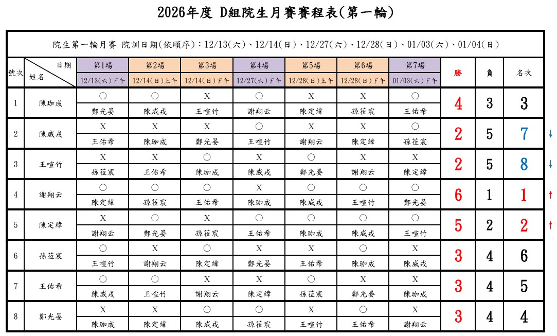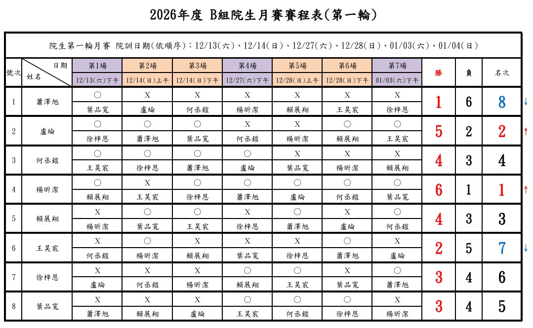 2026年度 院生第一輪月賽 所有賽程已結束,各組詳細戰績如下: