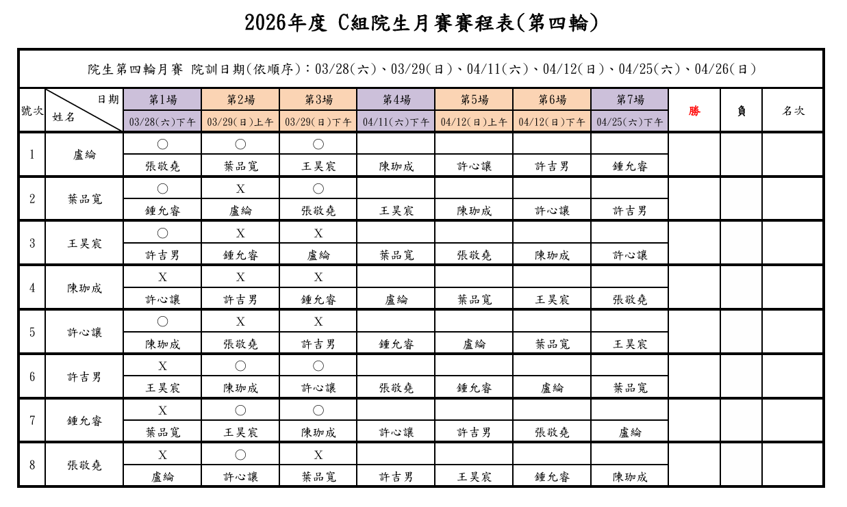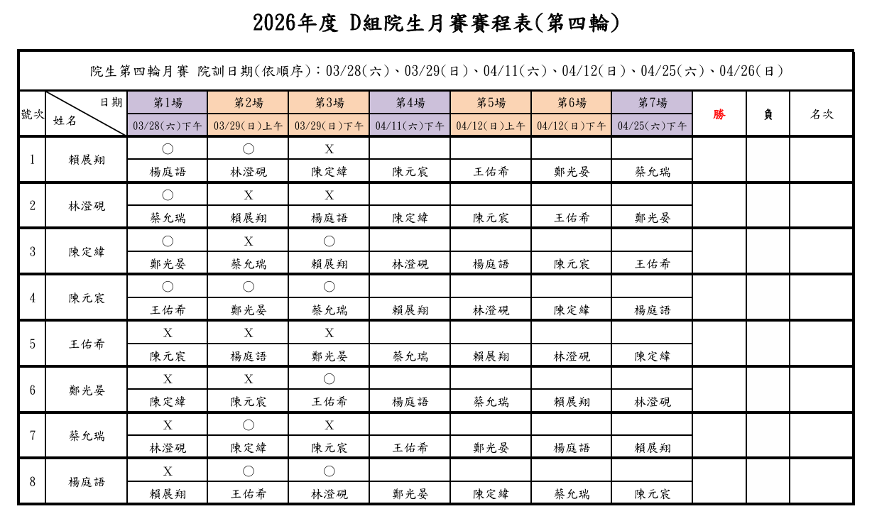 2026年度 院生第四輪月賽 - 第一週之訓練賽程已結束,各組詳細戰績如下: