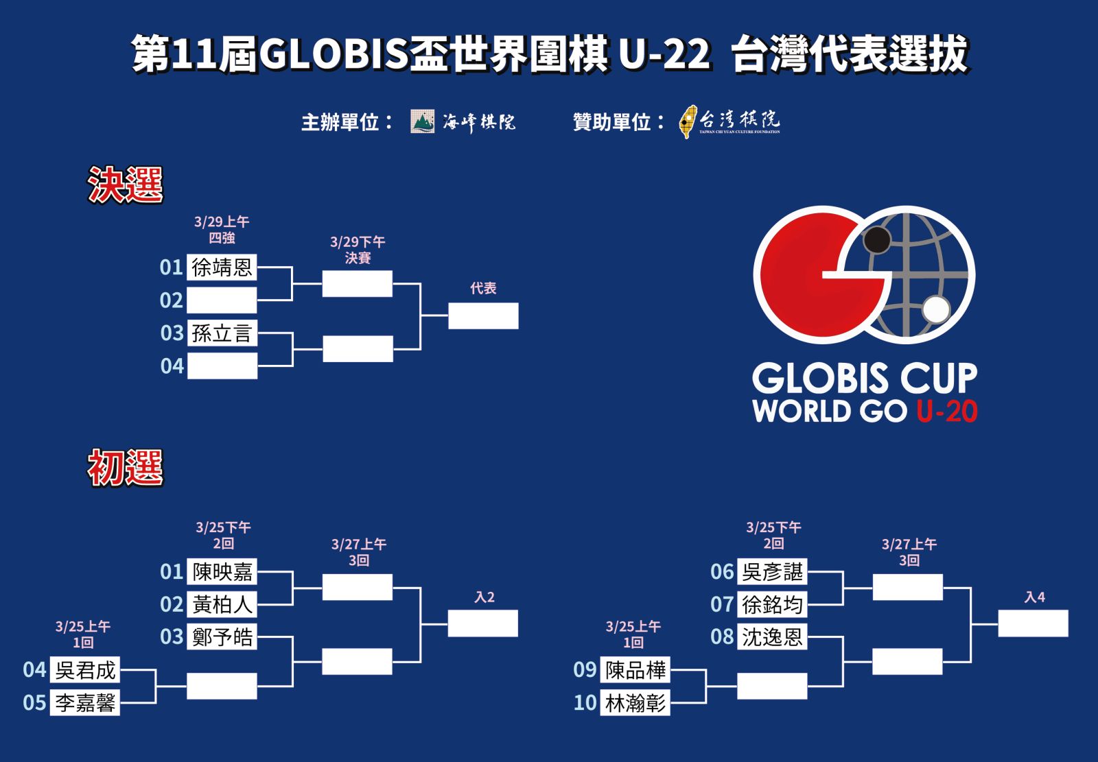 2026/03/23 第11屆GLOBIS盃世界圍棋 U-22 台灣代表選拔抽籤結果公告