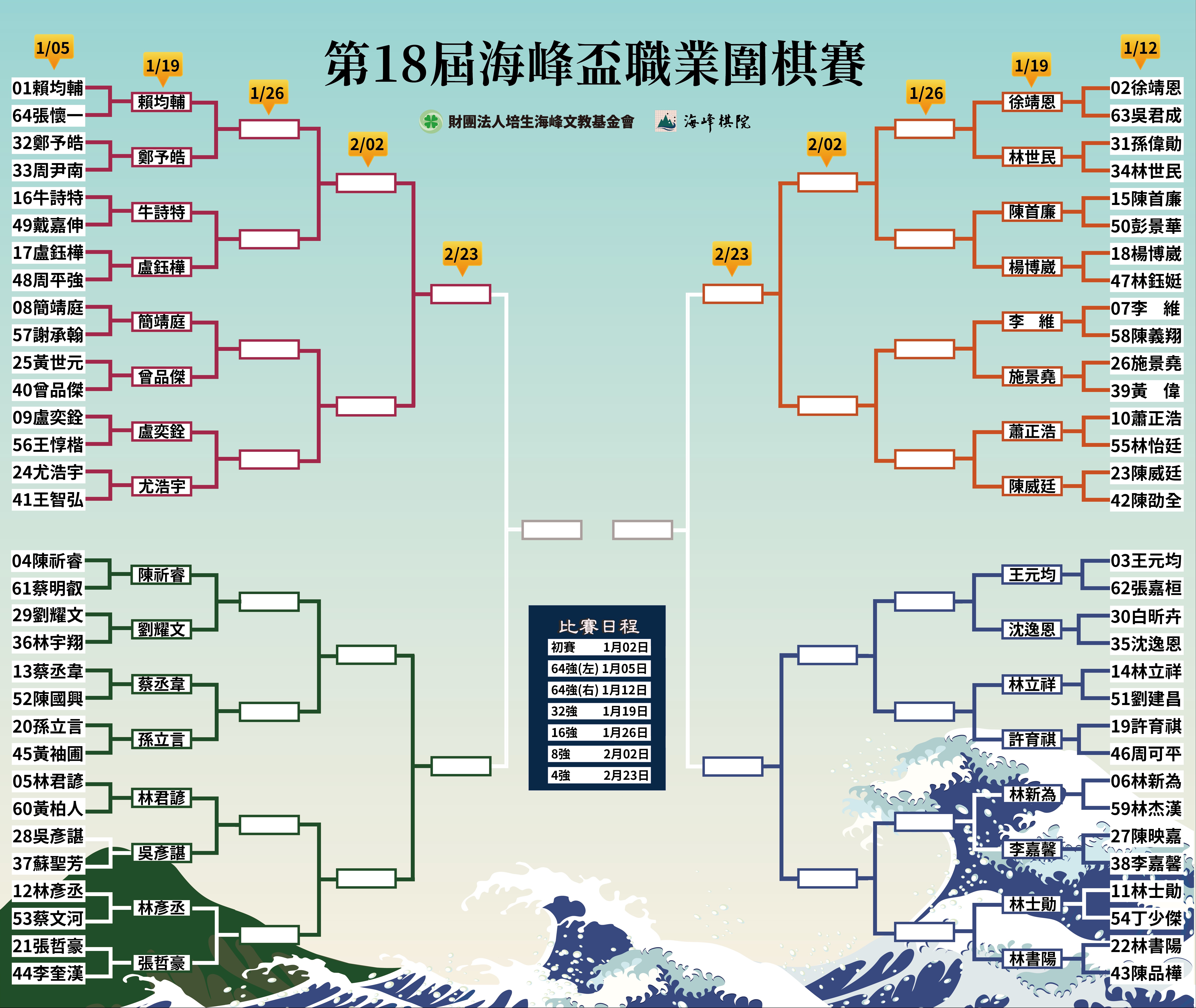 上屆海峰盃冠軍林君諺、名人賴均輔、陳祈睿九段、盧鈺樺女子名人、簡靖庭新人王等強手接連過關,右半區賽事將於1/12繼續舉行。