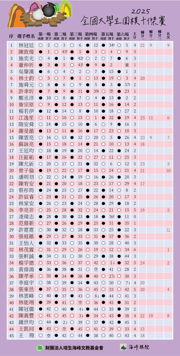台灣大學生圍棋年度盛事——「2025年大學生圍棋十傑賽」,於11月29、30日在台北海峰棋院舉行。本屆賽事競爭激烈,一共吸引45位業餘頂尖高手報名,參賽人數創下歷年新高,經過六回合激戰,由長庚大學電機系的應屆畢業生林茂霖7段與開南大學的楊孚德7段爭冠,兩人前五局均保持全勝戰績,後於冠軍戰交鋒,最終林茂霖憑藉卓越的計算與穩定的發揮,成功封王,榮膺本屆大學「首傑」,為他的大學棋士生涯畫下完美句點。