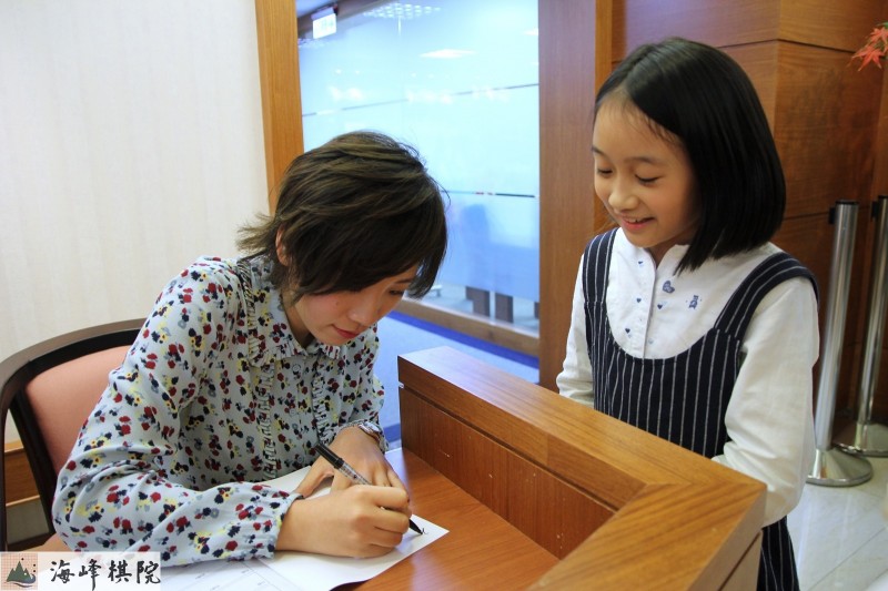 2018年謝依旻蒞臨海峰棋院,正在幫當時還是海峰道場學員的業餘6段李嘉馨簽名。