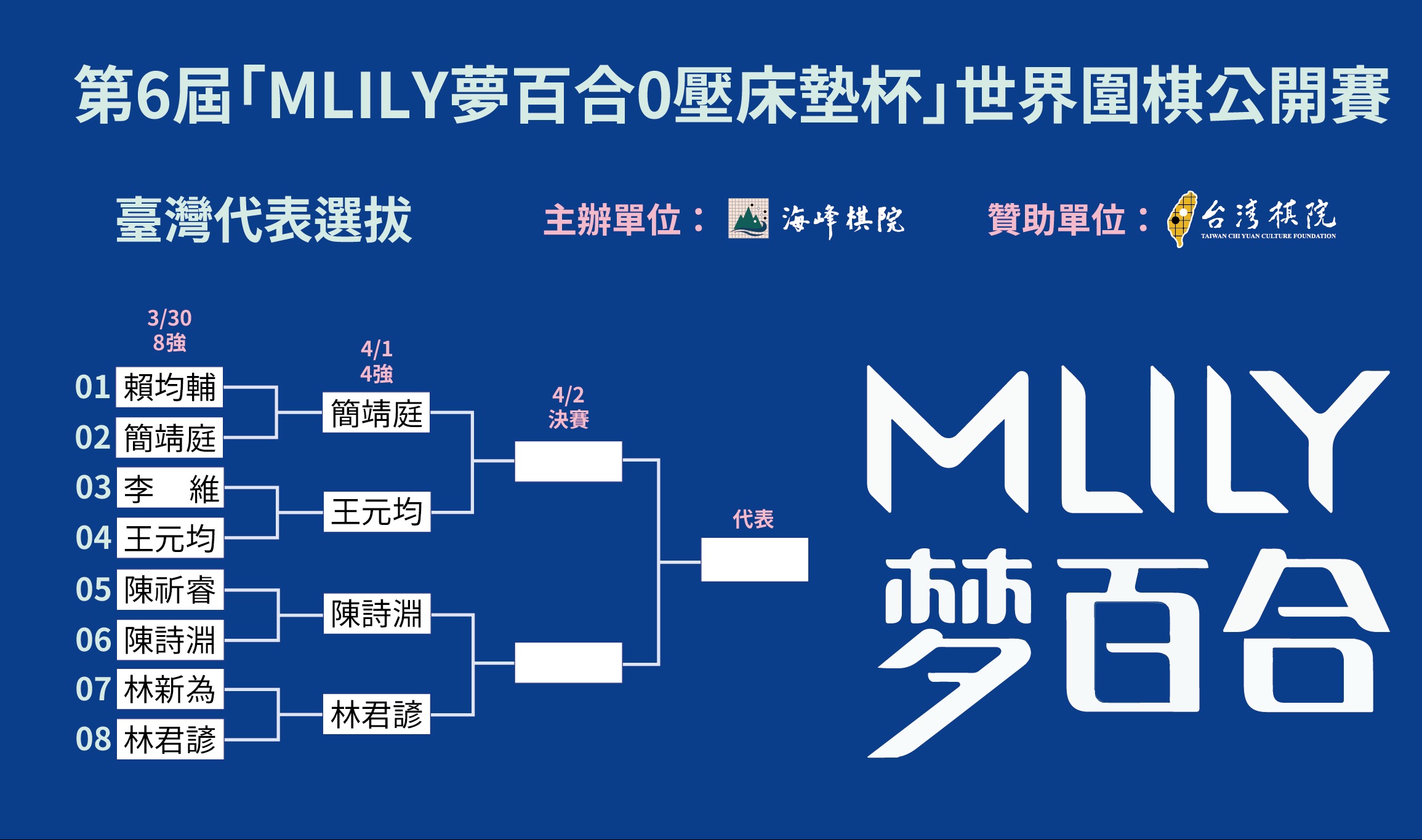 2026/3/30 第6屆「MLILY夢百合0壓床墊杯」世界圍棋公開賽臺灣代表選拔賽 決選8強成績