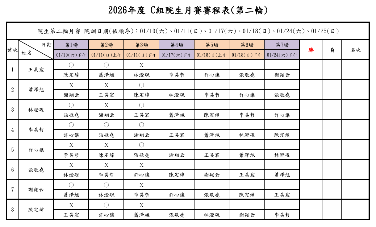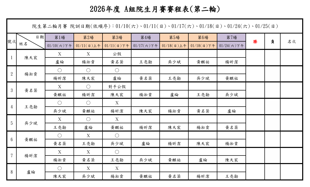 2026年度 院生第二輪月賽 - 第一週之訓練賽程已結束,各組詳細戰績如下:
