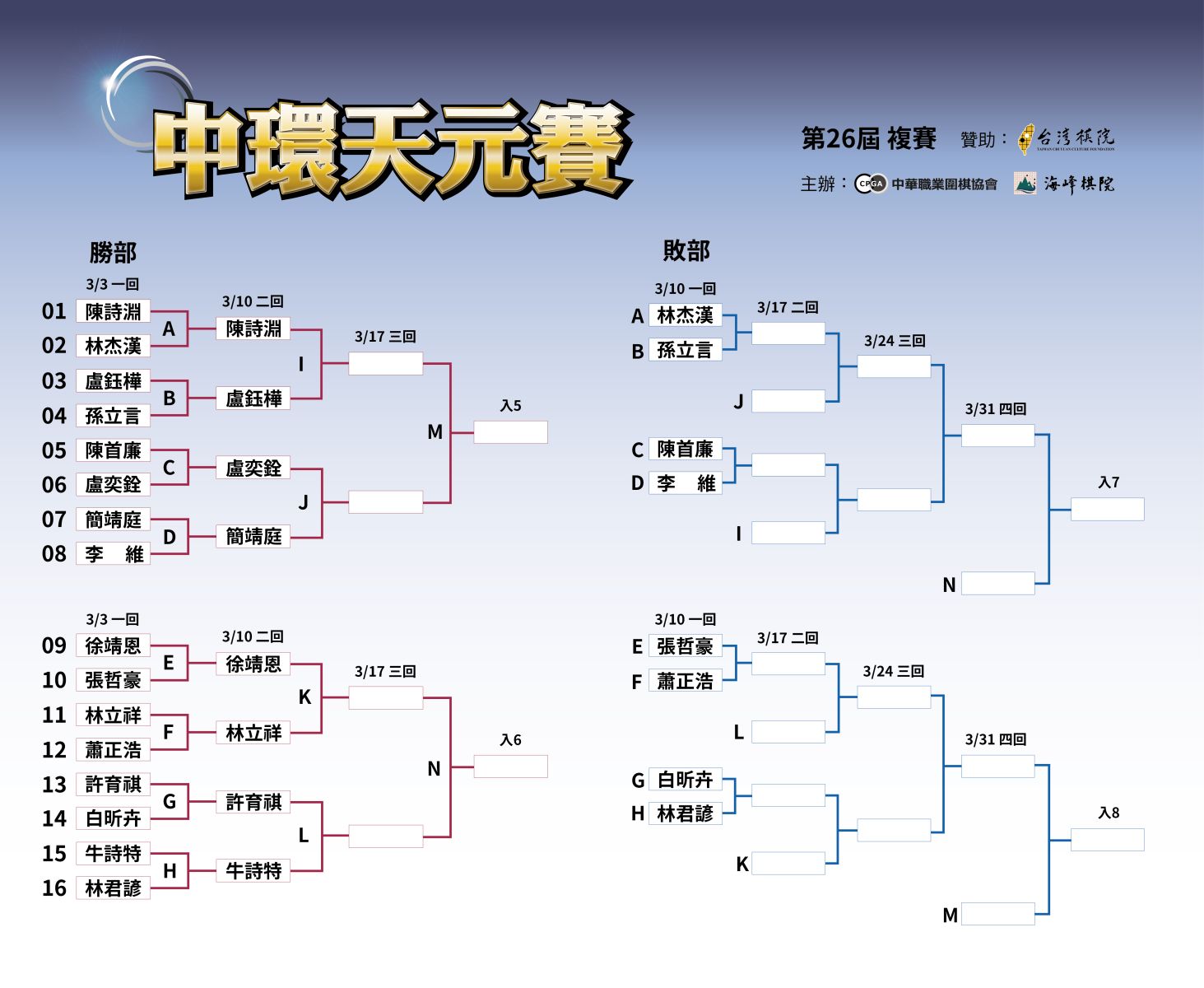 2026/03/03【中環天元複賽第一日成績:八位棋士晉級勝部二回戰】