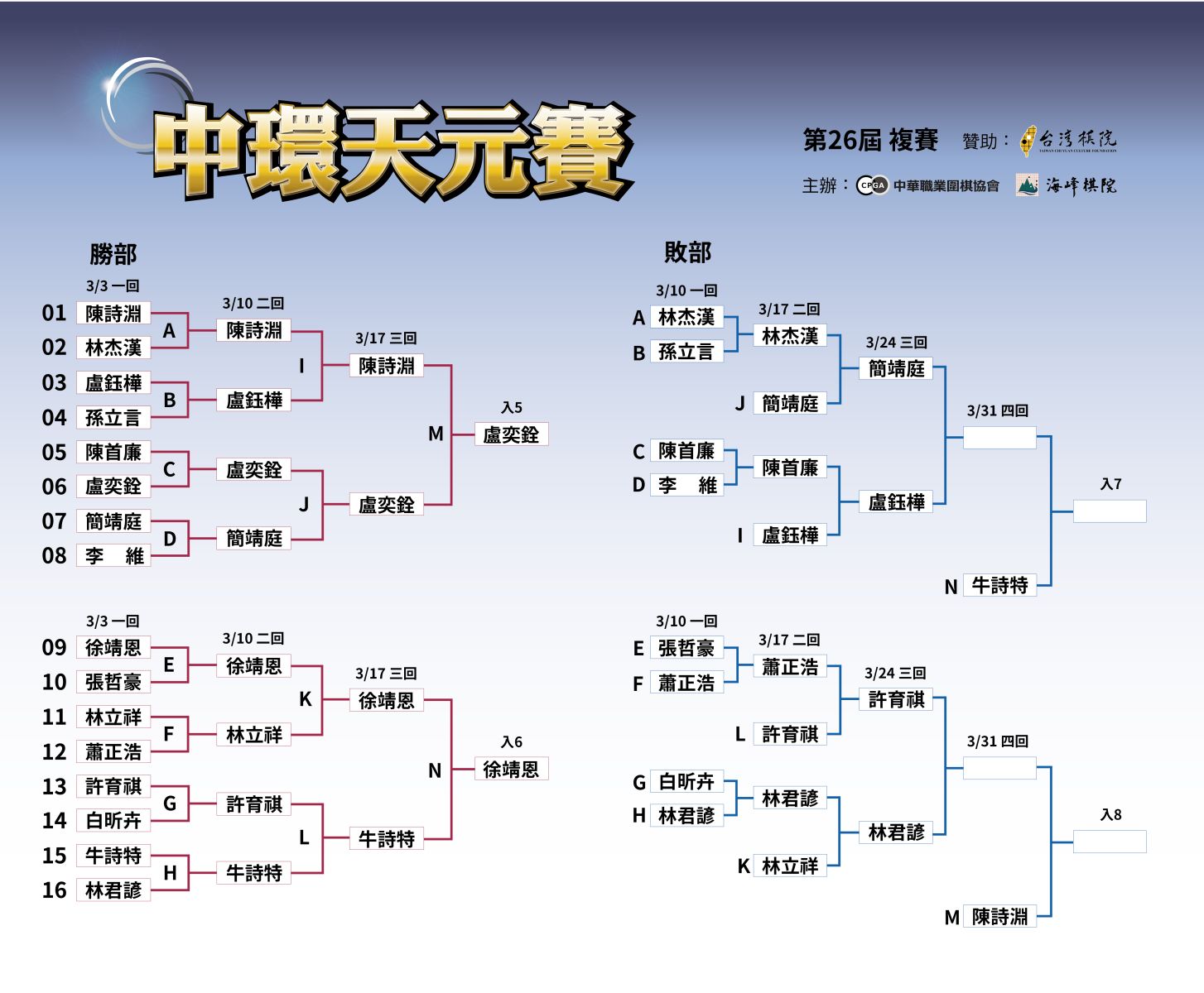 第26屆中環天元複賽3月31日在海峰棋院落幕,複賽經過數回合激戰,勝部徐靖恩快棋王、盧奕銓七段,以及敗部林君諺海峰盃、簡靖庭新人王,四人脫穎而出晉級循環圈!
