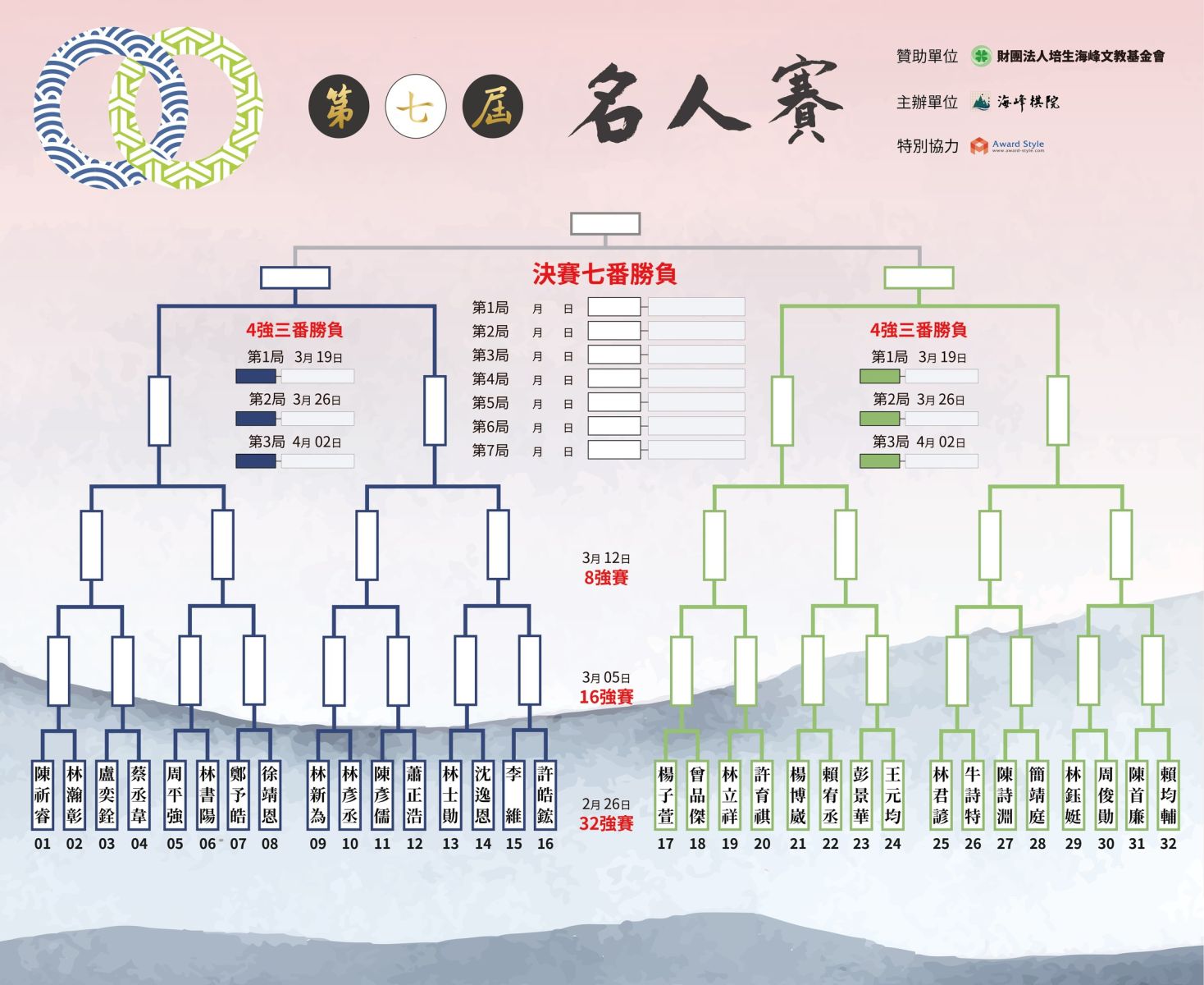 自2020年起,由海峰棋院舉辦的台灣圍棋名人賽今年邁入第7個年頭,初賽於農曆年前完成,許多棋界的熟悉面孔皆展現堅強的老將實力,不僅陳詩淵、林書陽等順利晉級,去年無緣晉級的周平強亦在敗部賽中連取孫偉勛和張哲豪兩位勁敵,勇闖本賽,而周平強的哥哥周俊勛雖在勝部賽中不敵強敵王元均,但周俊勛於敗部賽持白抓住機會,中盤戰勝對手劉耀文,強勢敗部復活。