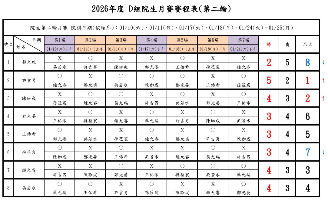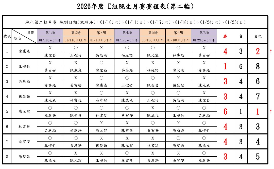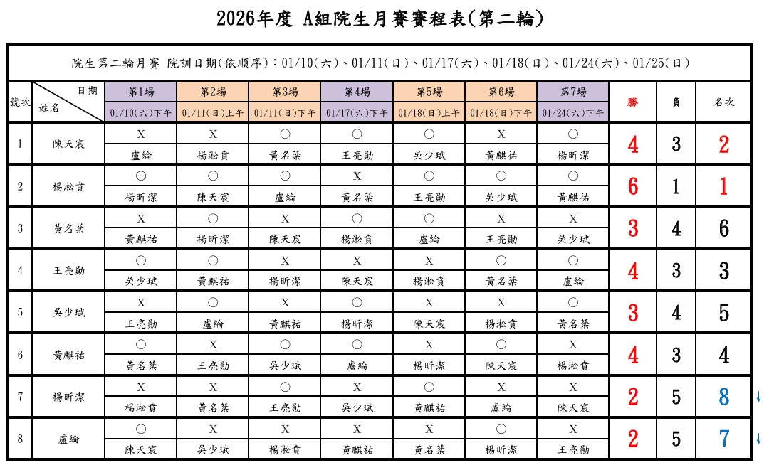 2026年度 院生第二輪月賽 所有賽程已結束,各組詳細戰績如下: