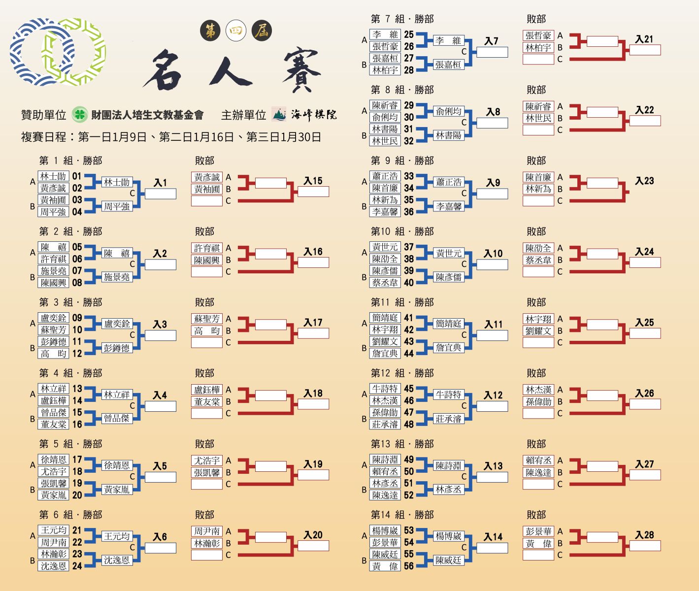 第4屆名人賽複賽敗部決賽,今天中午12:00登場,職業、業餘好手同場較勁,最終盧鈺樺女子名人、陳祈睿七段、簡靖庭六段、許育祺四段、林彥丞四段、彭鐏德三段、陳威廷三段、陳首廉三段、莊承濬三段、黃袖圃二段、張嘉桓二段、林瀚彰二段、尤浩宇初段、陳彥儒7段、等敗部區14名好手脫穎而出,晉級本賽32強。