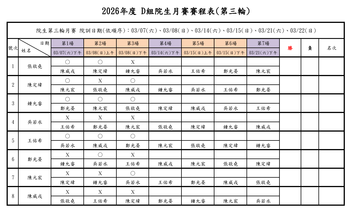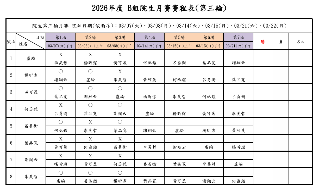 2026年度 院生第三輪月賽 - 第一週之訓練賽程已結束,各組詳細戰績如下: