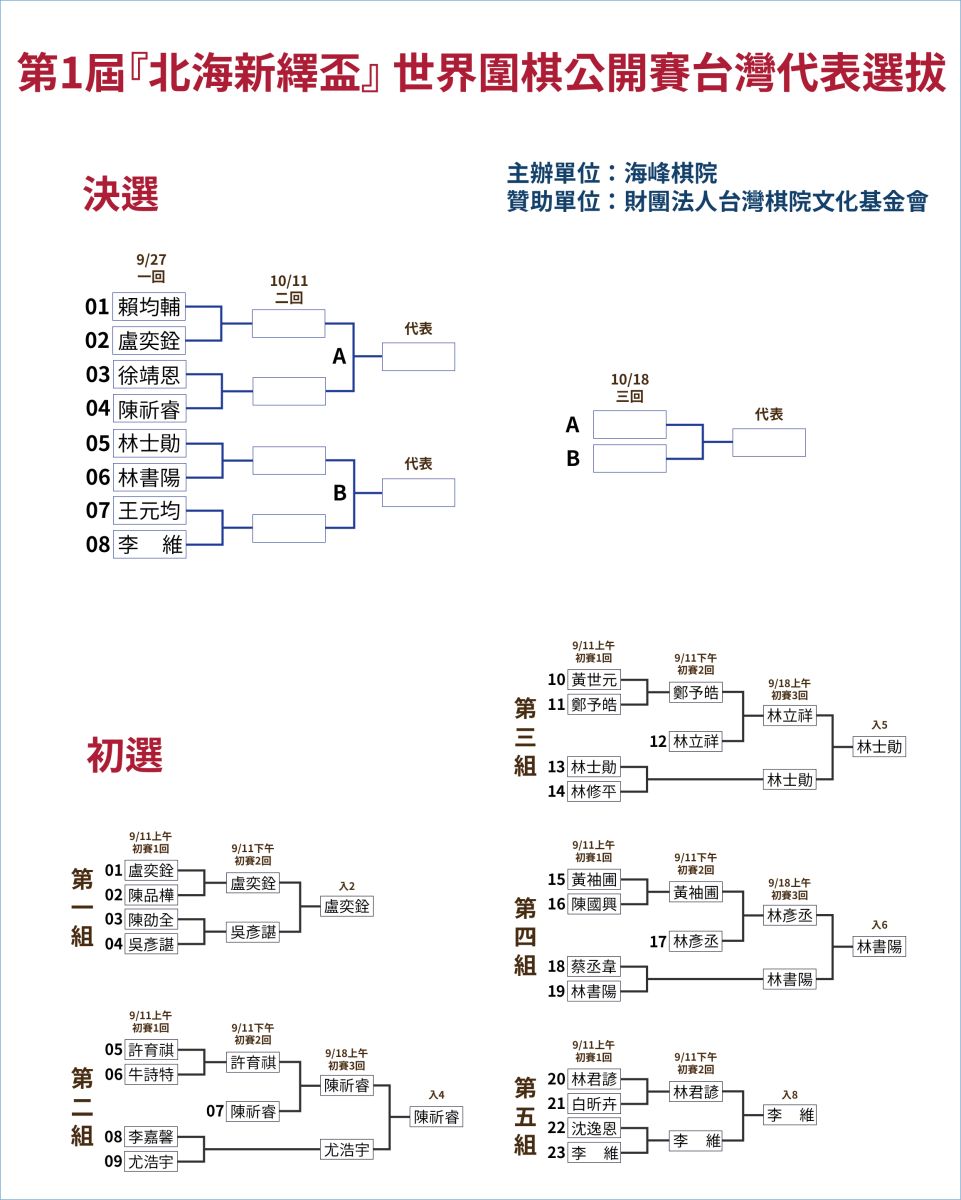 第1屆『北海新繹盃』世界圍棋公開賽台灣代表決選結果出爐,陳祈睿八段、王元均九段、賴均輔九段最終與免選的許皓鋐九段一同出線,晉級北海新繹盃世界賽64強。