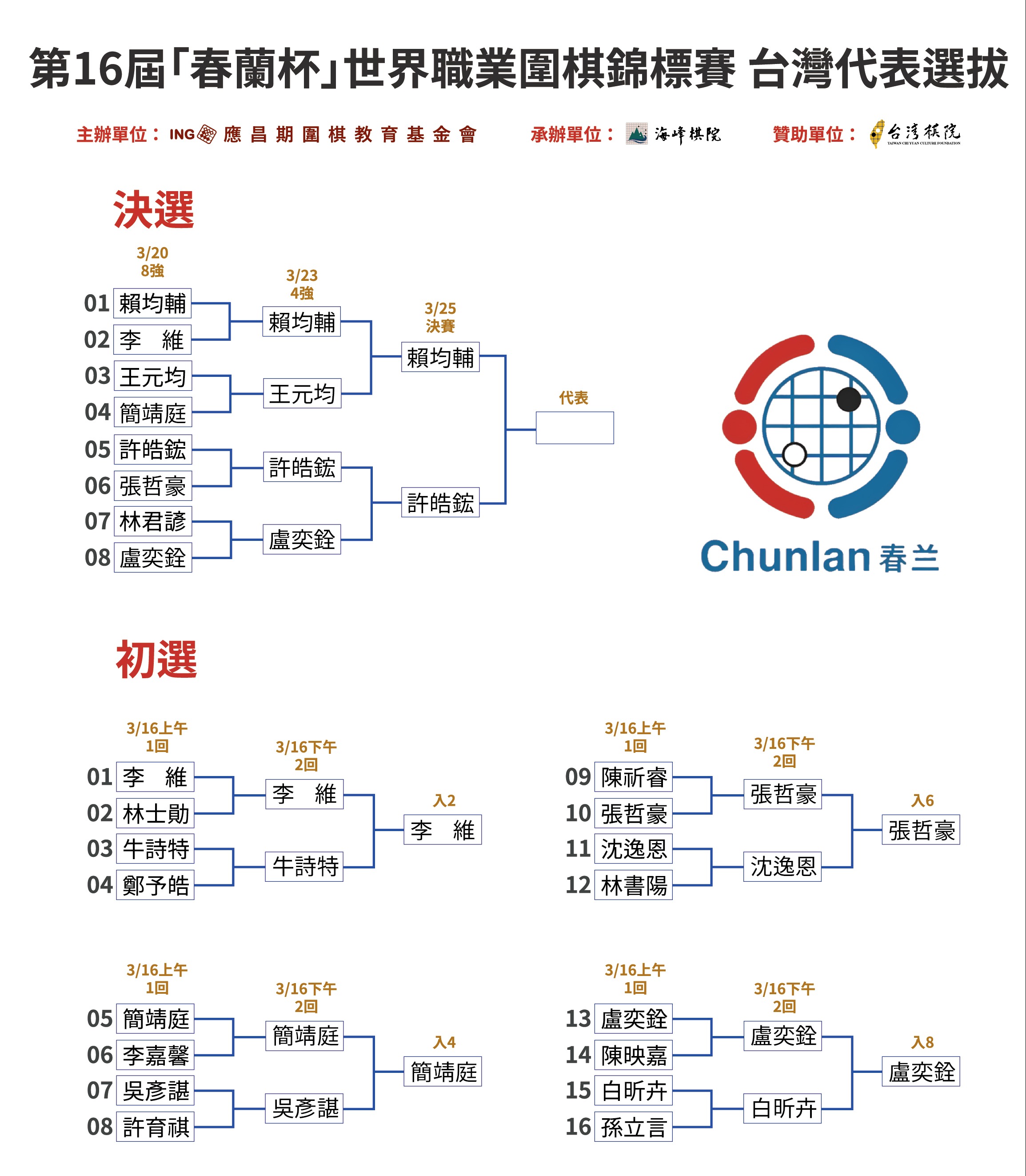 第16屆「春蘭杯」世界職業圍棋錦標賽 台灣代表選拔賽決選成績,賴均輔九段、許皓鋐九段會師決賽!