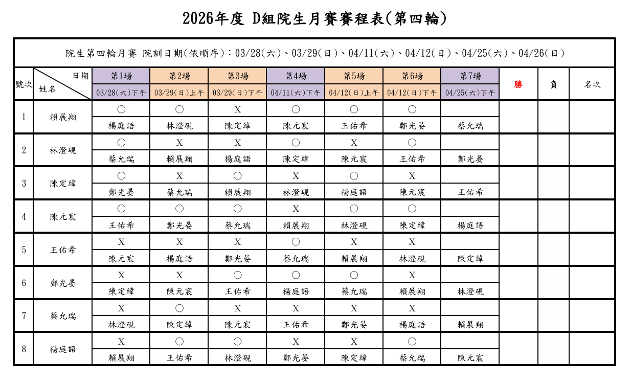 2026年度 院生第四輪月賽 - 第二週之訓練賽程已結束,各組詳細戰績如下: