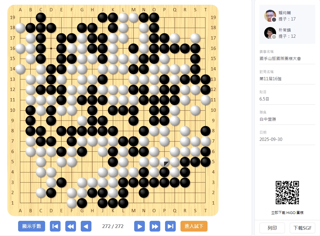 【國手山脈杯(上)】 第11屆國手山脈杯16強 黑:賴均輔 白:朴常鎮