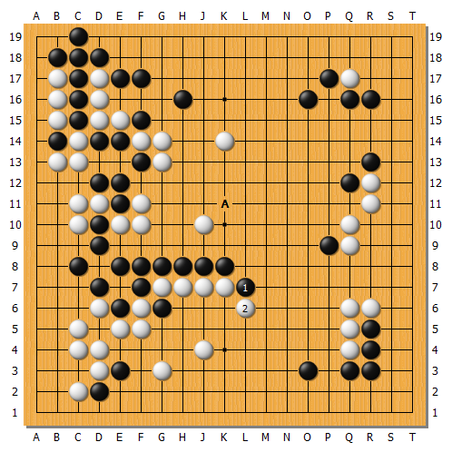 本局均輔執黑,前面經過一番戰鬥後各取所需局面接近,下面白地很大,黑棋則發展上邊。實戰均輔黑1扳頭是必然的一手,此時白2跟著扳。此手穩健在A補棋也是可以考慮。那樣也是差不多但左下白棋空會縮水,實戰白2跟著應給了黑棋進攻機會,黑棋中央該如何進攻白棋呢?