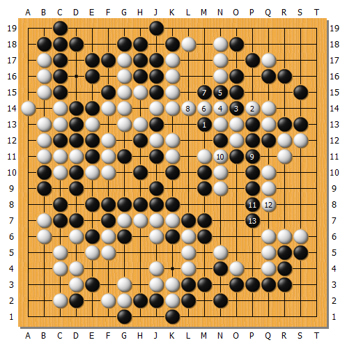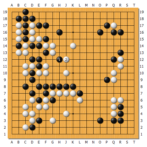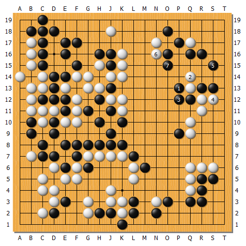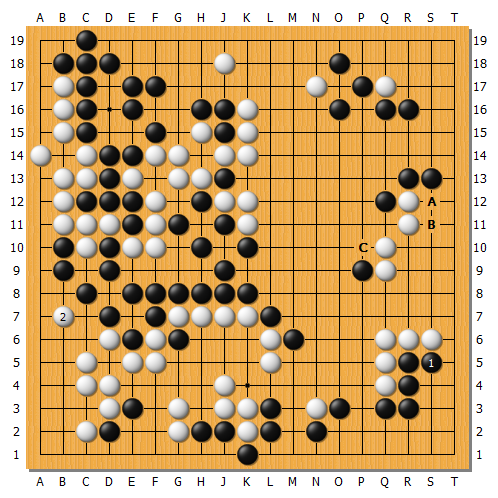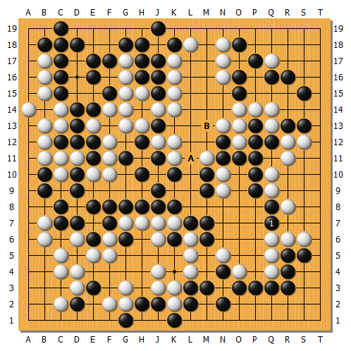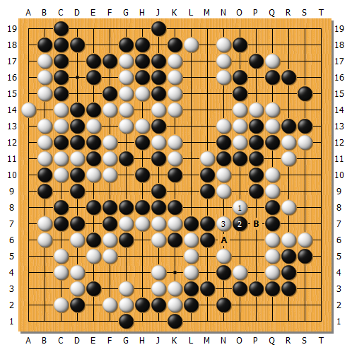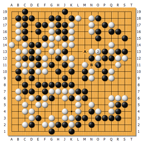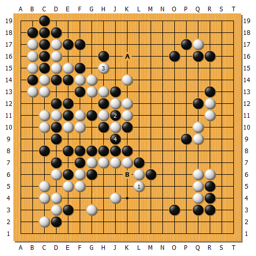 實戰白棋跟著1應,黑棋逃過一劫。白3尖處理中央讓劫,但黑4消劫也可考慮繼續A圍地,因為中央B斷還有許多劫材。實戰這樣基本又回到五五開的局面進入後半盤。
