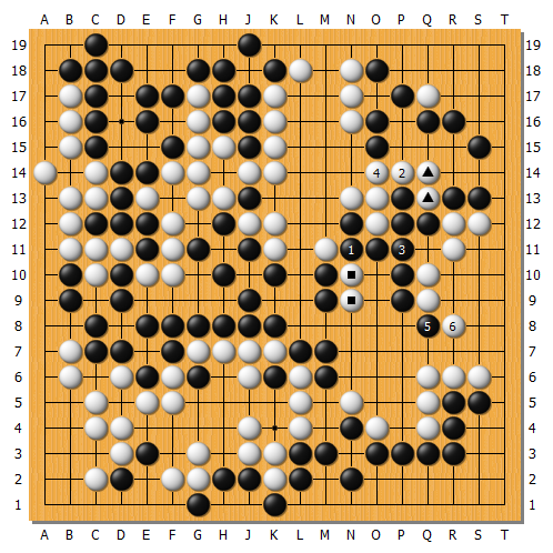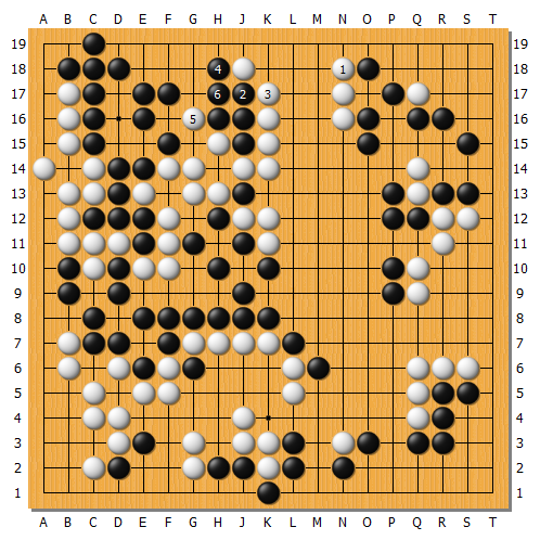 實戰黑1繼續打吃,白棋再2反打,黑3、5提完開劫。因為此後白棋A叫吃可連絡三子,因此此劫應該是黑棋壓力稍大一些。將會關係到全局厚薄。