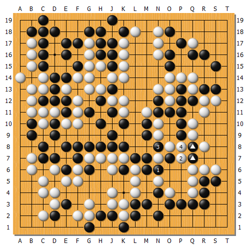 實戰黑棋也只好無奈1、3提掉,白棋下到2、4吃掉黑兩子收穫巨大。此處黑棋的虧損大於一個貼目,黑棋也無以為繼。均輔非常遺憾的輸掉本局。