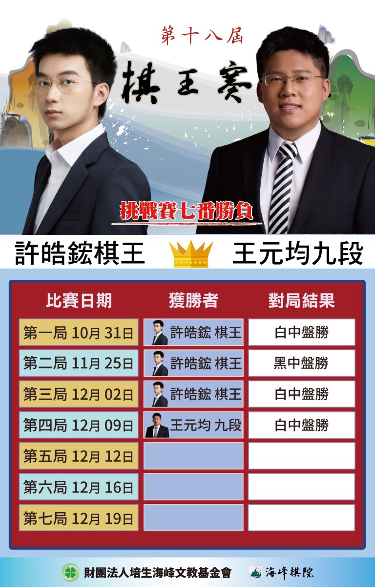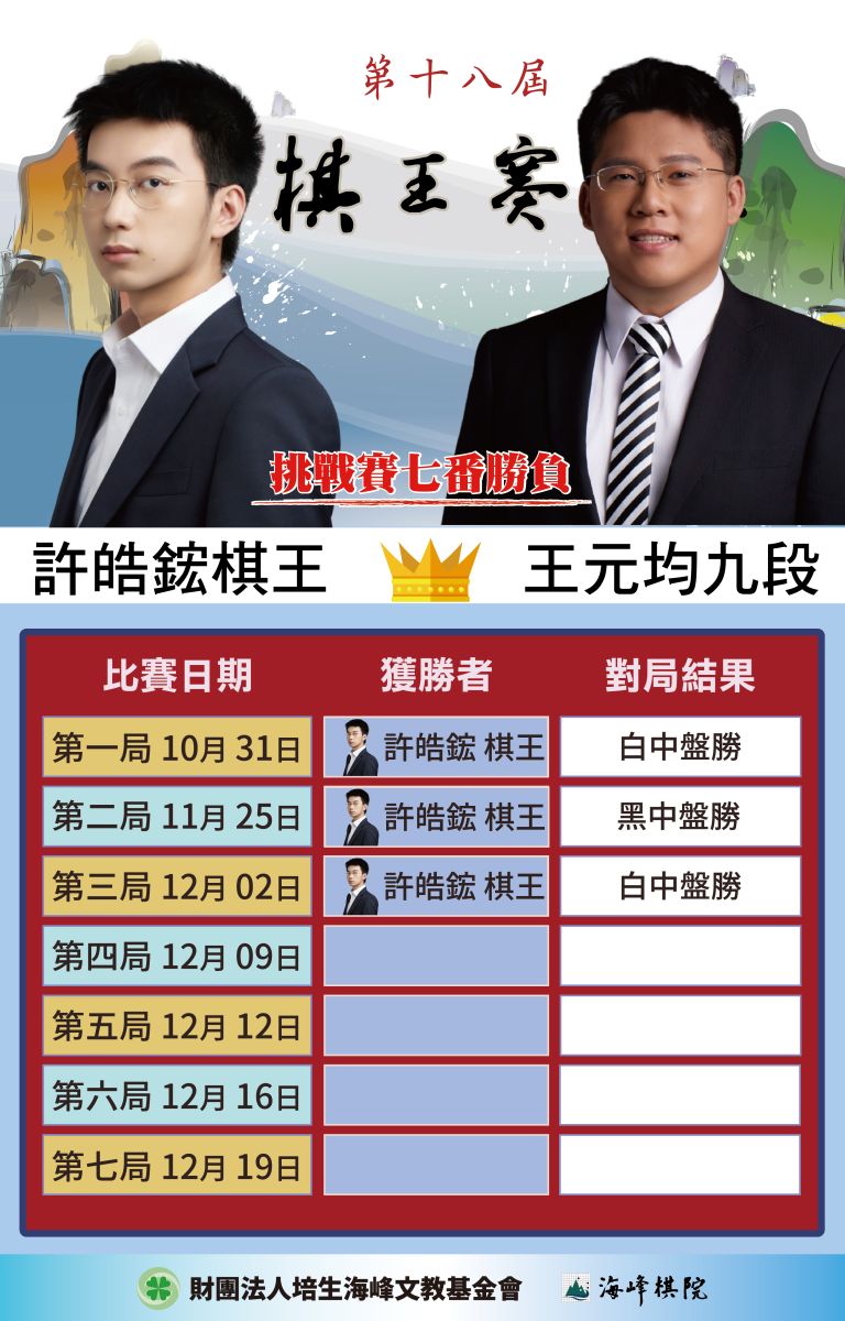 第18屆棋王挑戰賽戰火持續,衛冕棋王許皓鋐於今(2)日再度擊敗挑戰者王元均九段,在七番勝負中取得關鍵第三勝,目前以3比0的優勢遙遙領先,許皓鋐距離達成棋王四連霸僅剩一步之遙。