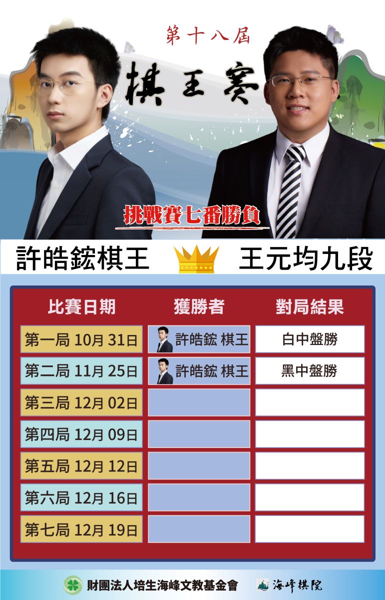 接下來,因許皓鋐棋王將前往韓國參加三星盃世界圍棋大師賽,挑戰賽七番勝負第二局預定於11月25日(二)舉行。