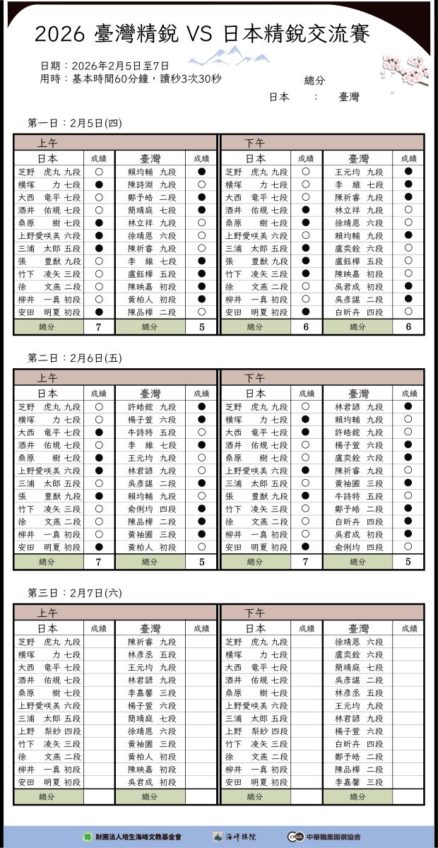 2/6下午第4輪成績:日本7:5臺灣